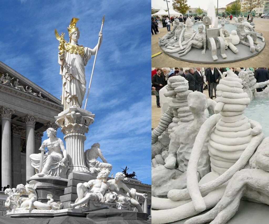 Rechts der Jubiläumsbrunnen von 2023 im Wiener Bezirk Favoriten. Alles muss auf den kleinsten gemeinsamen Nenner nivelliert werden, denn Unterschiede darf es im Paradies nicht geben. Jedes Haus, jeder Raum, jeder Brunnen, jedes Kunstwerk muss so gestaltet sein, dass auch Zehnjährige sie fabrizieren können. Links der Pallas-Athene-Brunnen von 1870.