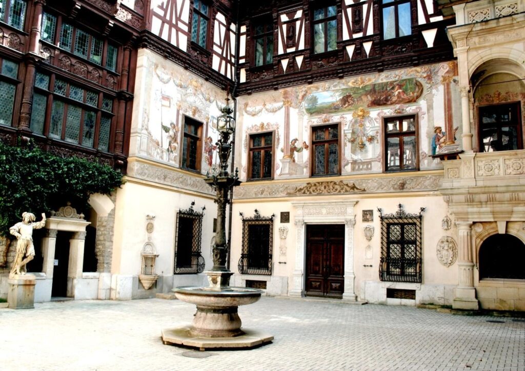 Innenhof des Schlosses Peleș, erbaut 1883. Gestaltung mit Tier-, Pflanzen- und Heldenmotiven, für das Leben. Komplexität statt Verflachung. Wertschätzung am Detail, an Arbeit, an Kunst, an Leidenschaft, an individueller Meisterschaft.